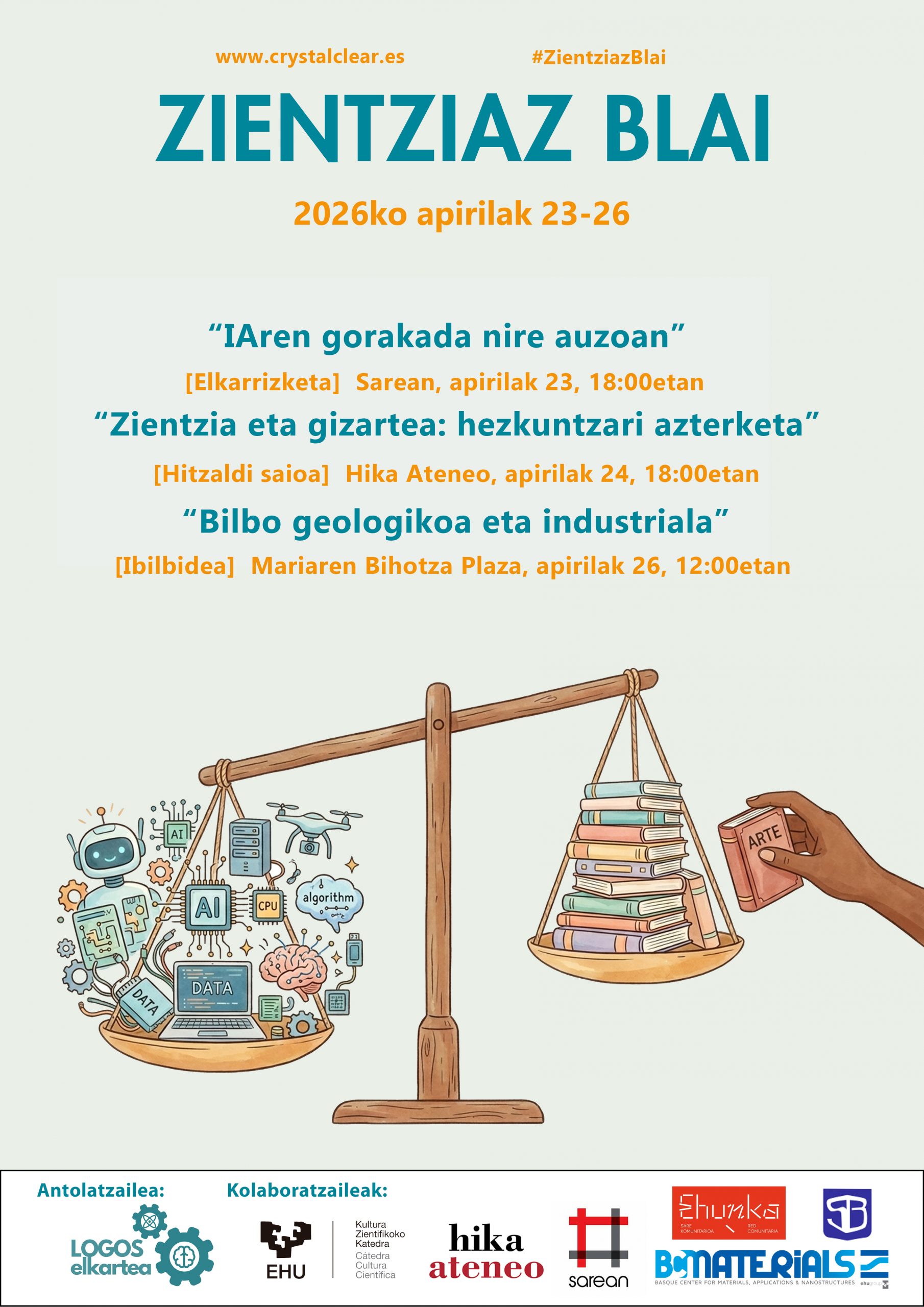 Zientziaz Blai 2026 abordará en esta, su séptima edición, temas de gran interés e impacto social: el auge de la inteligencia artificial, la eu, las pseudociencias/pseudoterapias y la innovación y el avance tecnológico para afrontar los retos del futuro (tecnooptimismo). Temas que cada vez ganan más relevancia en nuestra sociedad altamente dependiente de la ciencia y la tecnología. Desde el día 8 hasta el 10 de mayo se sucederán las siguientes actividades de divulgación científica: